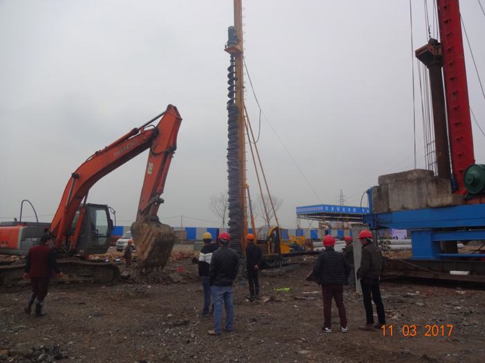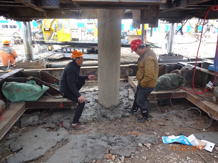 之后,引孔樁機進場到位,對現(xiàn)場管樁打樁位置進行專業(yè)引孔和配重靜壓兩種方式結(jié)合的打樁方法,結(jié)果順利并成功完成了符合設(shè)計要求的基礎(chǔ)管樁工作